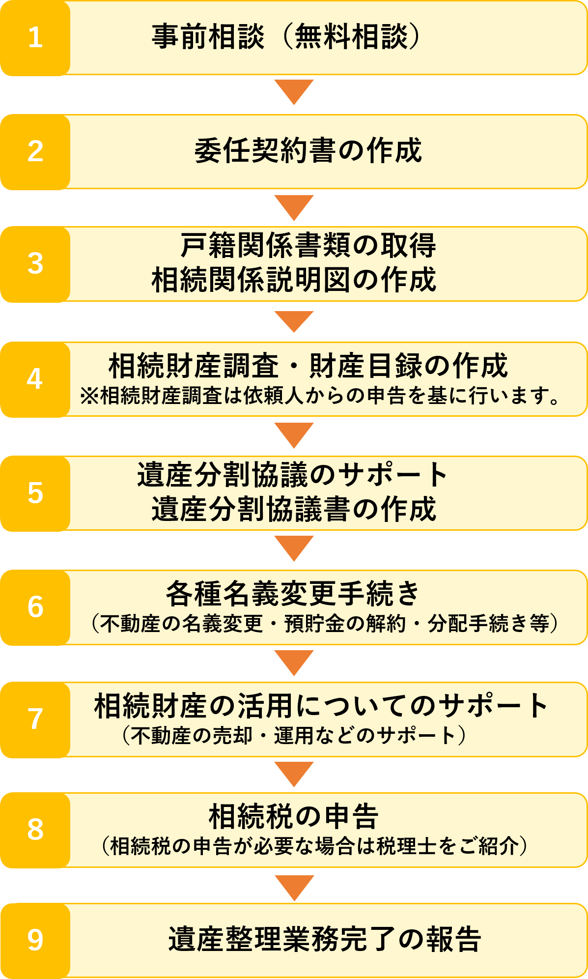 戸籍収集や不動産の相続登記、家庭裁判所での相続放棄など |